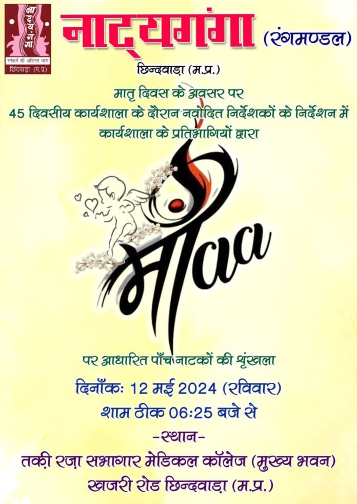 स्टेट डेस्क/छिंदवाड़ा- संस्कृति मंत्रालय भारत सरकार से मान्यता प्राप्त जिले का एकमात्र रंगमंडल नाट्यगंगा के द्वारा आयोजित 45 दिवसीय फिल्म एवं थियेटर एक्टिंग वर्कशॉप के प्रतिभागियां के द्वारा आज मातृ दिवस के अवसर पर पाँच नाटकों के मंचन किए जाएँगे। इन पॉंचों नाटक की कहानियों का मूल विषय माँ पर केंद्रित होगा।
