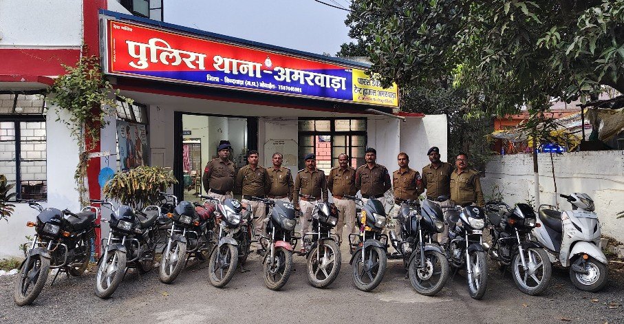 स्टेट डेस्क/छिन्दवाड़ा- अमरवाड़ा पुलिस ने दो बाइक चोर पकड़े हैं जिनके पास से 11 चोरी की बाइक बरामद की गई है। दरअसल पुलिस अधीक्षक अजय पाण्डे, अतिरिक्त पुलिस अधीक्षक ए.पी. सिंह द्वारा लगातार अपराधों की पतासाजी एवं अवैध कामों की रोकथाम हेतु लगातार निर्देश दिये जा रहे हैं। निर्देशानुसार अमरवाड़ा पुलिस द्वारा मुखबिर तंत्र सक्रिय करते हुये 02 आरोपी के कब्जे से कुल 11 मोटर सायकल बरामद करने में सफलता हासिल की है।