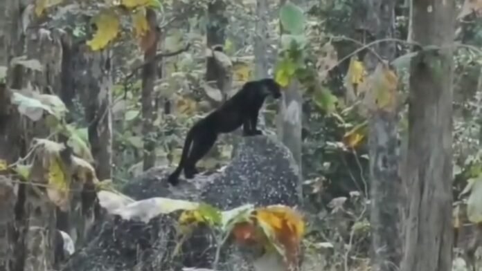 स्टेट डेस्क/छिंदवाड़ा। छिंदवाड़ा पेंच टाइगर रिजर्व पार्क के कर्माझिरी गेट में दुर्लभ प्रजाति का ब्लैक पैंथर (काला तेंदुआ) दिखा है। पेंच नेशनल पार्क के कर्माझिरी गेट से सफारी करने पहुंचे पर्यटकों को ब्लैक पैंथर चट्टान के उपर बैठा दिखा, जिसे लोगों ने अपने कैमरे में कैद किया। बता दें कि पेंच टाइगर रिजर्व में धीरे धीरे अब दुर्लभ ब्लैक पैंथर का कुनबा बढ़ रहा है। पर्यटकों को इसके पहले कुछ माह पूर्व काला तेंदुआ देखने को मिला था।